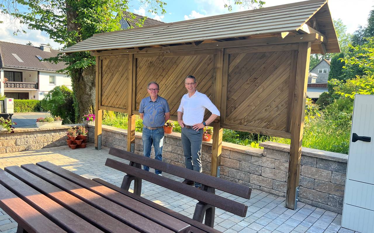 „An der Dorfmitte in Mollseifen führen viele Wanderwege vorbei. Wanderer können nun an dem neuen Tisch und den neuen Bänken des Vesperplatzes ihre Brotzeit einnehmen. Auch wurde die Informationstafel erneuert, so können sich demnächst Bürgerinnen und Bürger, aber auch Gäste hier zum Beispiel über bevorstehende Veranstaltungen informieren“, so Ortsvorsteher Volker Geier und Winterbergs Bürgermeister Michael Beckmann.