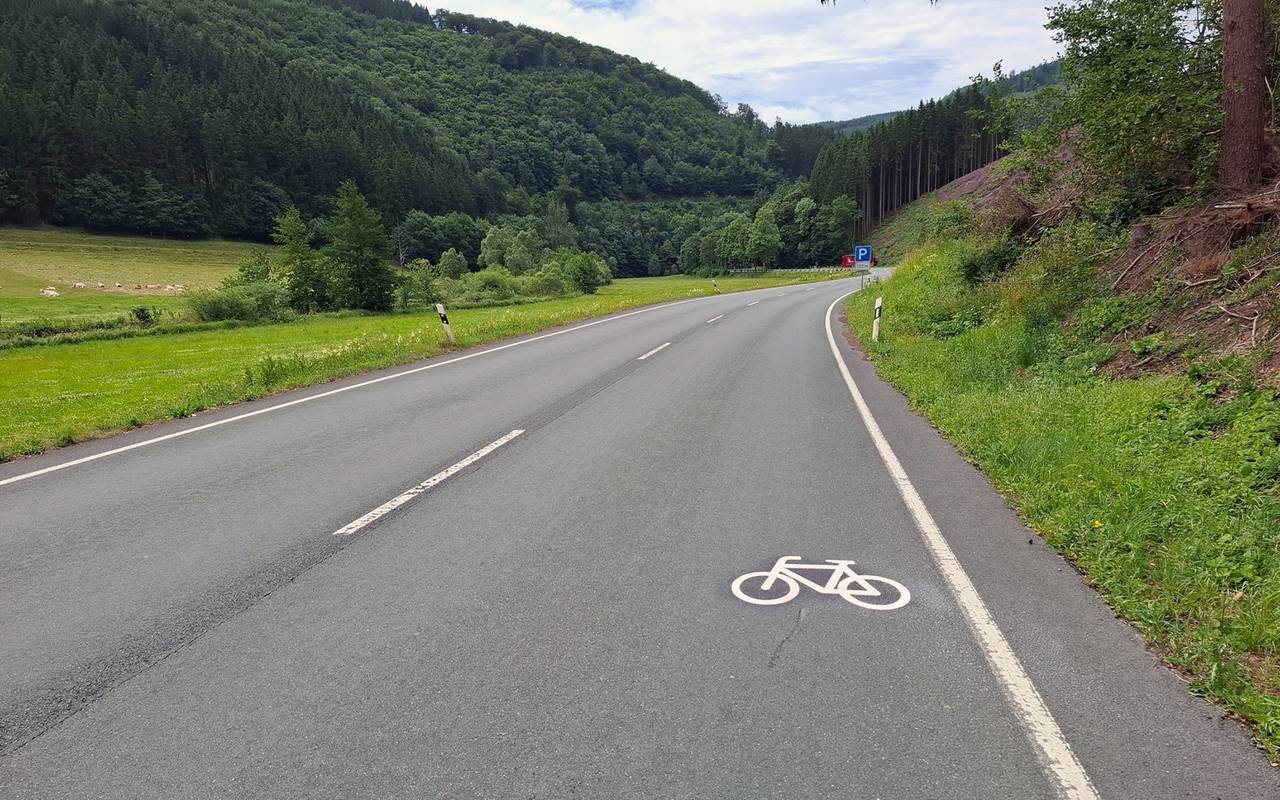 Markierungen entlang der B236 zwischen Schmallenberg-Lenne und Lennestadt-Störmecke sollen Autofahrer für den Radverkehr sensibilisieren. Bis dort ein Radweg gebaut wird, kann es dauern