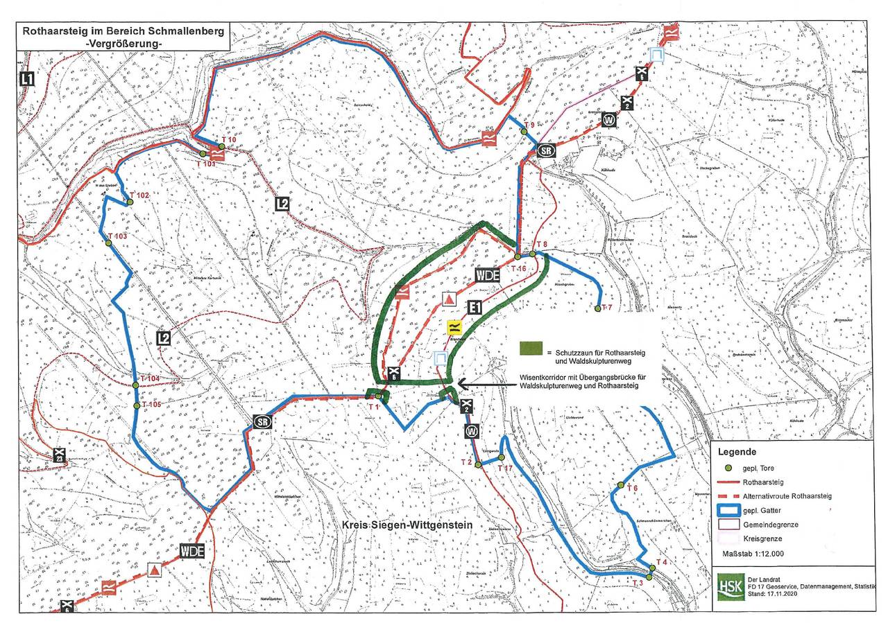 Das könnte man zum Beispiel mit mehr Zäunen umgehen, so der Tourismusverband. Die Zäune könnten Besucher und Tiere schützen. Den Tieren sollte ein Korridor vom südlichen ins nördliche Gatter ermöglicht werden, diesen könnten die Wanderer über eine Brücke überqueren, schlägt der Schmallenberger Tourismusverband vor. Aber auch dann würden die Wanderwege bei Schmallenberg-Laptrop zum Teil eingeschränkt werden. Aus Sicht des Schmallenber Tourismusverbands sollte das Gatter insgesamt daher besser auf dem Gebiet von Bad Berleburg entstehen.