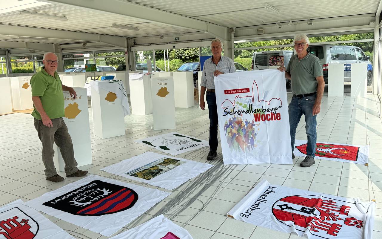 Parallel dazu schreitet auch die Vorbereitung für den sogenannten Fahnenhimmel voran. "Alle Fahnen sind produziert und werden nun montagefertig vorbereitet, um zur Schmallenberger Woche strahlend über der Dörfermeile zu wehen", wissen Hubertus Wüllner, Helmut Hartmann und Martin Vollmert (v.li.) von der Aktionsgemeinschaft Schmallenberg e.V.. "Die Vorfreude ist groß – und sie wächst von Tag zu Tag. Schmallenberg rückt zusammen. Und macht sich bereit für ein Fest der Heimat, der Begegnung und des Zusammenhalts."