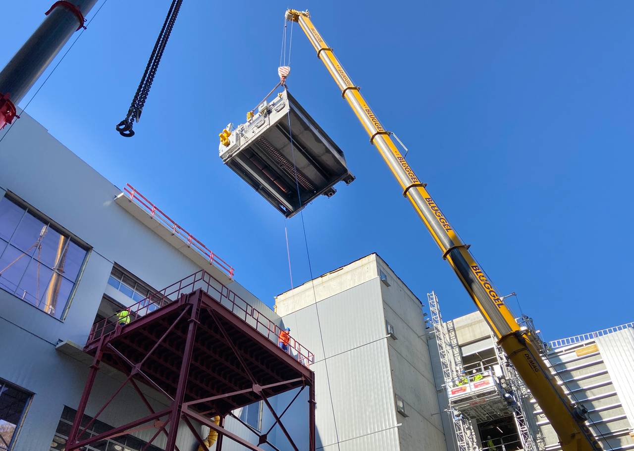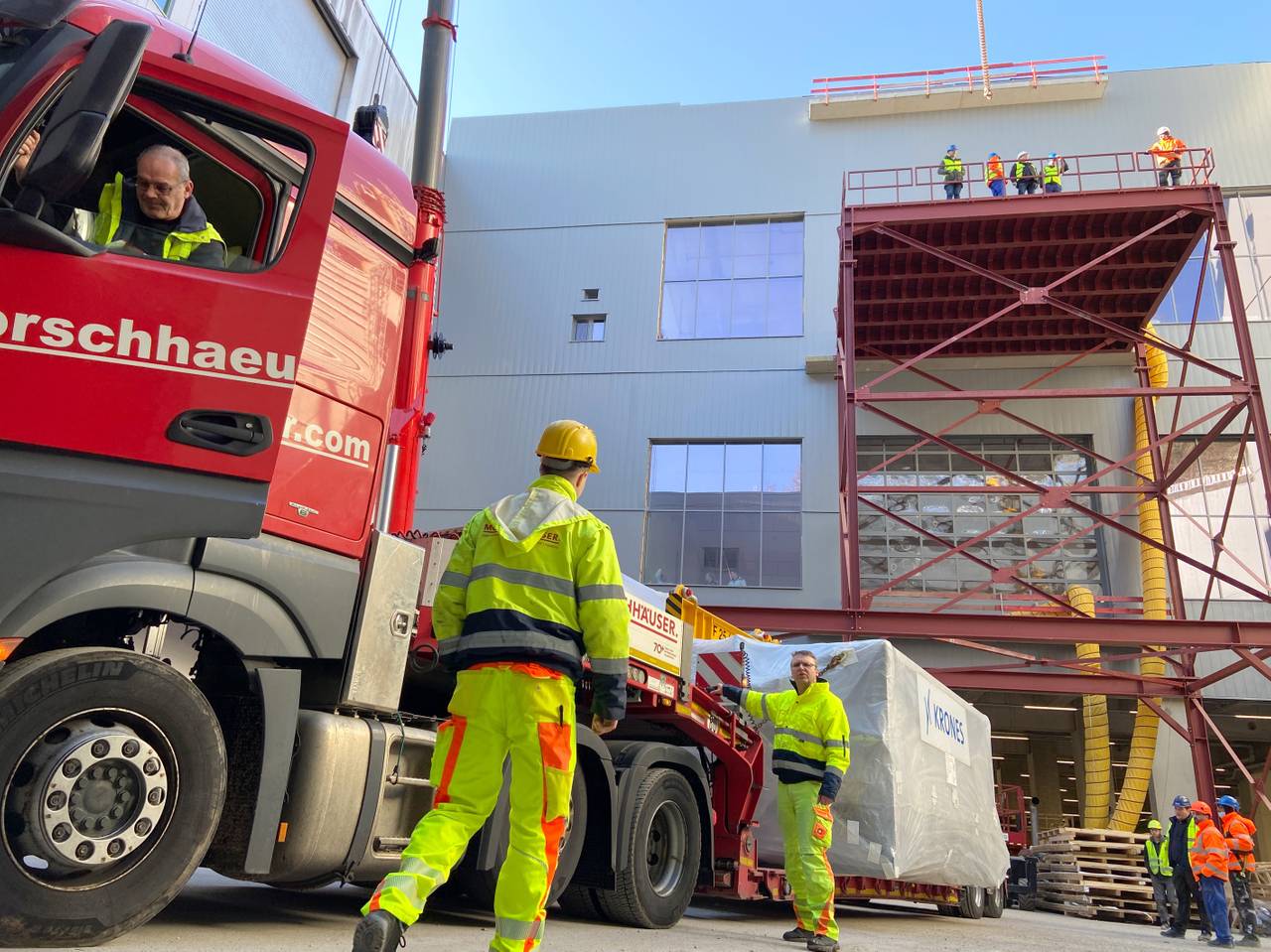 Schwertransporter bringen Anlagenteile zur Brauerei Veltins