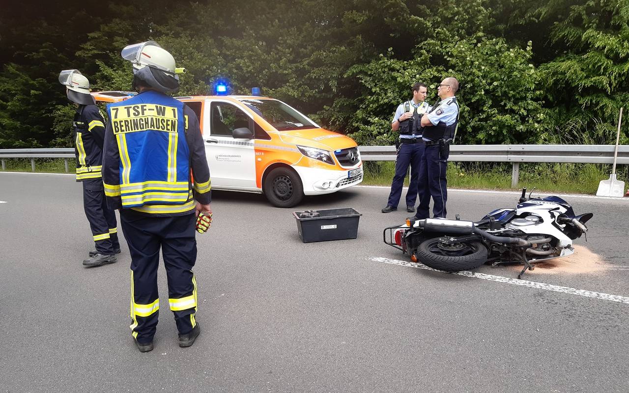 In Marsberg ist gesten eine Motorradfahrerin bei einem Verkehrsunfall schwer verletzt worden. Nach Angaben der Feuerwehr Marsberg war sie in der Mittagszeit in Höhe der Firma WEPA gemeinsam mit ihrem Vater aus Richtung Giershagen kommend unterwegs. In einer scharfen Kurve verlor sie die Kontrolle über ihr Motorrad, stürzte über die Leitplanke und blieb nahe der Straße liegen. Nachdem der Vater den Notruf absetzte, alarmierte die Leitstelle den Rettungsdienst sowie die Feuerwehren aus Bredelar und Beringhausen zur Einsatzstelle. Die eintreffenden Einsatzkräfte kümmerten sich unverzüglich um die Versorgung der Frau. Da der Notarzt aufgrund des Unfallhergangs und der Untersuchung vor Ort von schweren Verletzungen ausgehen musste, wurde ein Rettungshubschrauber angefordert. Seitens der Feuerwehr wurde die Unfallstelle gesichert, auslaufende Betriebsstoffe aufgenommen sowie der Rettungsdienst bei der Versorgung der Patientin unterstützt. Mit dem Rettungshubschrauber wurde die Motorradfahrerin ins Klinikum Kassel geflogen. Die Polizei nahm vor Ort Ermittlungen zum Unfallhergang auf. Für diese Zeit war die L870 zwischen der Firma WEPA und der B7 komplett gesperrt, etwa knapp anderthalb Stunden. Seitens der Feuerwehr waren 15 Einsatzkräfte aus Bredelar und Beringhausen im Einsatz, heißt es von der Feuerwehr Marsberg.
