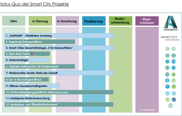 Arnsberg ist zusammen mit Bad Berleburg, Menden, Olpe und Soest Pionierstadt als Smart City in Südwestfalen. Dabei setzt Arnsberg seit Jahren auch lokale Schwerpunkte. Heute berichtet die Stadtverwaltung über den Stand der Projekte im Ausschuss für Digitalen Wandel. Das Stadtlabor ist schon längst umgesetzt. Es bringt Menschen zusammen und beleuchtet Zukunftsthemen. In der Planungsphase sind noch ein Konzept für intelligente Straßenbeleuchtung und ein Up- und Recyclingkaufhaus. Die Smart Citys wollen mit moderner Technik das Leben in den Städte lebenswerter machen.