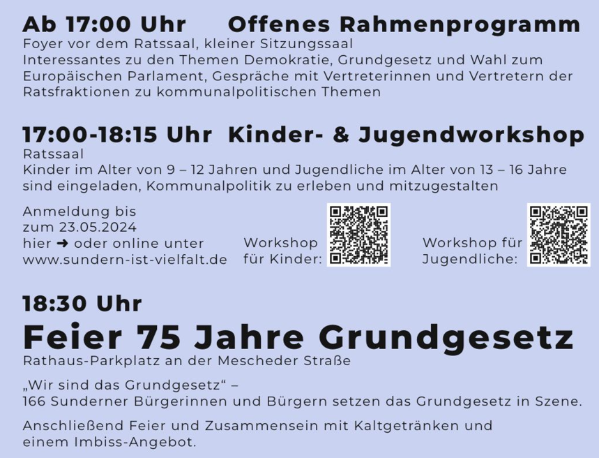In Sundern wird heute an den 75.Geburtstag des Grundgesetzes erinnert. Um 17:00 Uhr öffnet das Rathaus Sundern seine Türen. Geboten wird ein Rahmenprogramm für jede Altersgruppe. Das Highlight sei die eigentliche Feier, ab 18:30 Uhr, bei der 166 Bürgerinnen und Bürger das Grundgesetz unter dem Motto „Wir sind das Grundgesetz“ in Szene setzen. Im Anschluss wird zum geselligen Zusammensein bei Kaltgetränken und einem Imbiss geladen. Organisiert wird die Veranstaltung vom Sunderner Bündnis Demokratie und Vielfalt.