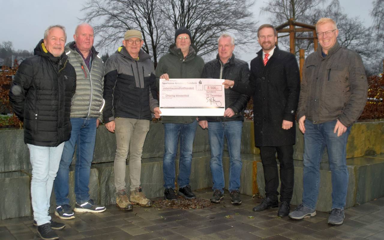 Die Stiftung der Sparkasse Arnsberg-Sundern hat die Dorfgemeinschaft in Sundern-Westenfeld erneut unterstützt. Nachdem sie den Ortsring Westenfeld in diesem Jahr bereits finanziell bei der Neugestaltung des Dorfplatzes unterstützt hatte, gab es jetzt einen weiteren Spendenscheck in Höhe von 7.500 Euro. Auf beiden Seiten der Schützenhalle gibt es jetzt Sitzgelegenheiten. Helfer setzten dort Blöcke aus Anröchter Naturstein, die teilweise zur Abstützung dienen, aber in erster Linie zum Sitzen genutzt werden können.