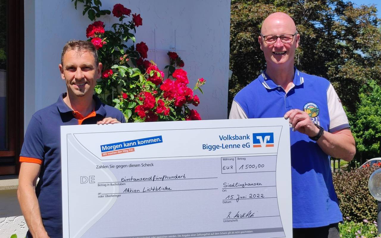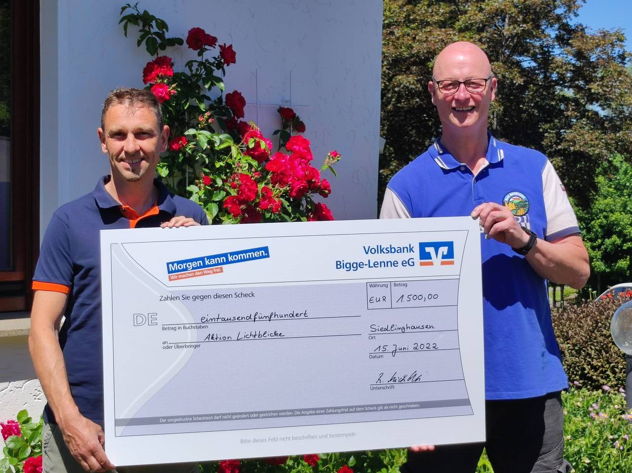 Der FC 20 Siedlinghausen hat bei seinem Jubiläum 100+2 im Mai 2022 1500 Euro für Lichtblicke gesammelt. (1. Vorsitzender Ralf Michalski, l., und Geschäftsführer Michael Trippe)