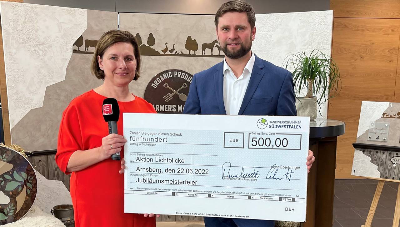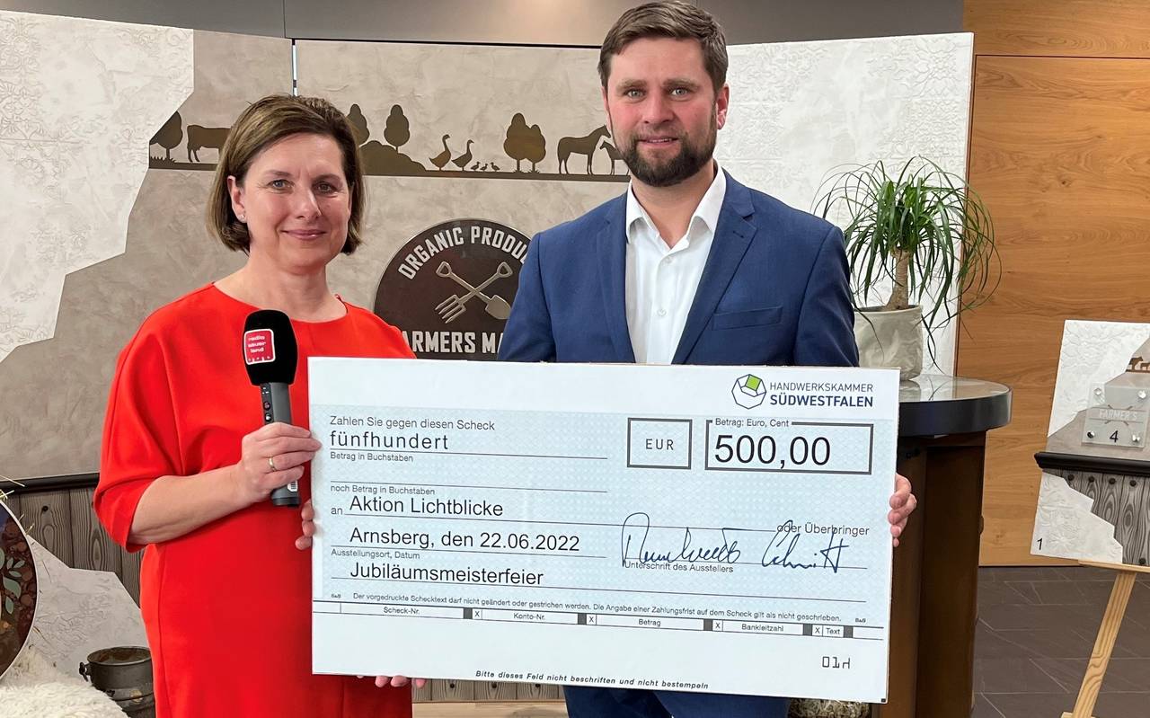 Hauptgeschäftsführer Hendrik Schmitt übergibt den Spendenscheck an Radio Sauerland-Chefredakteurin Anke Gebhardt. Bei der Jubiläumsmeisterfeier sind 500 Euro gesammelt worden.