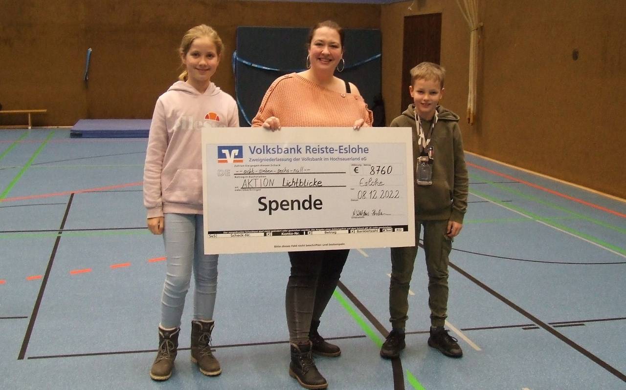 Die Kinder der Raphaelgrundschule Eslohe haben 8760 Euro für Lichtblicke bei einem Spendenlauf gesammelt und den Scheck an Radio Sauerland-Moderatorin Carolin Linke übergeben.