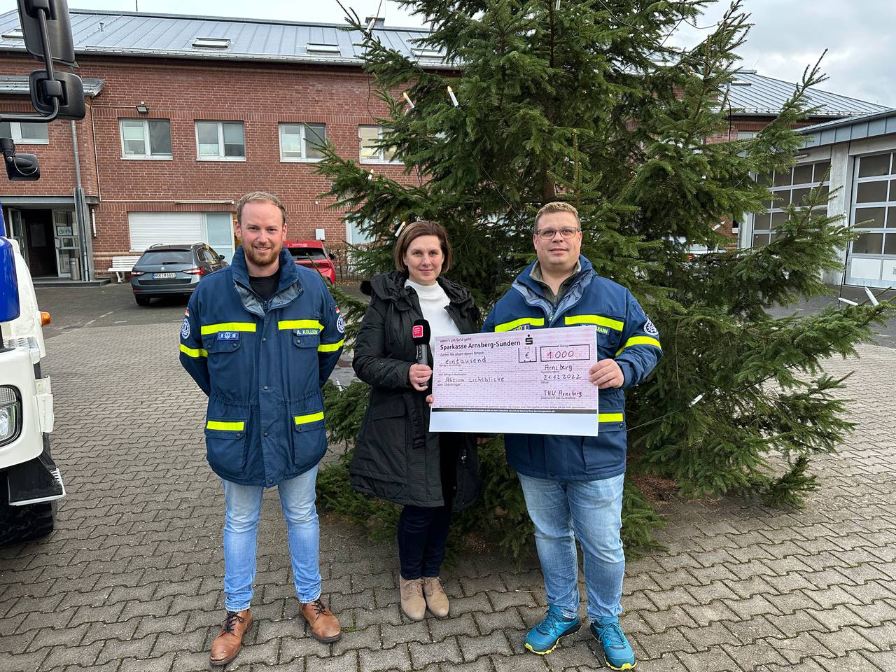 Der THW-Ortsverband Arnsberg übergibt seine Lichtblicke-Spende an Chefredakteurin Anke Gebhardt.