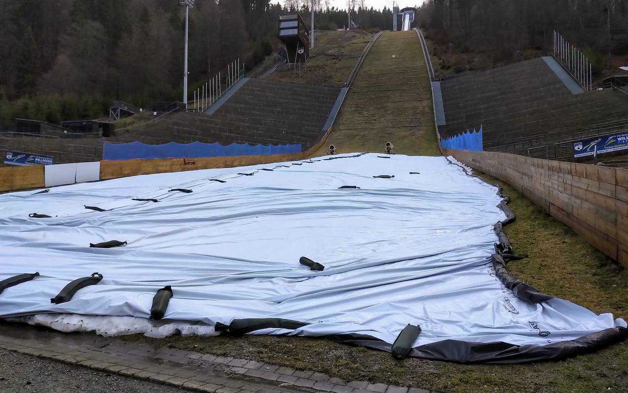 Die Vorbereitungen für den Willinger Weltcup im Skispringen in vier Wochen sind schon gestartet. Die Hälfte des Schnees für das Skispringen wurde von den Schneekanonen schon produziert. Der Schnee wurde schon mit Planen abgedeckt, damit er nicht schmilzt. Seit gestern ist außerdem die sogenannte "Snowfactory" im Einsatz. Diese Schneekanone produziert Crasheis bei bis zu 10 Grad plus.