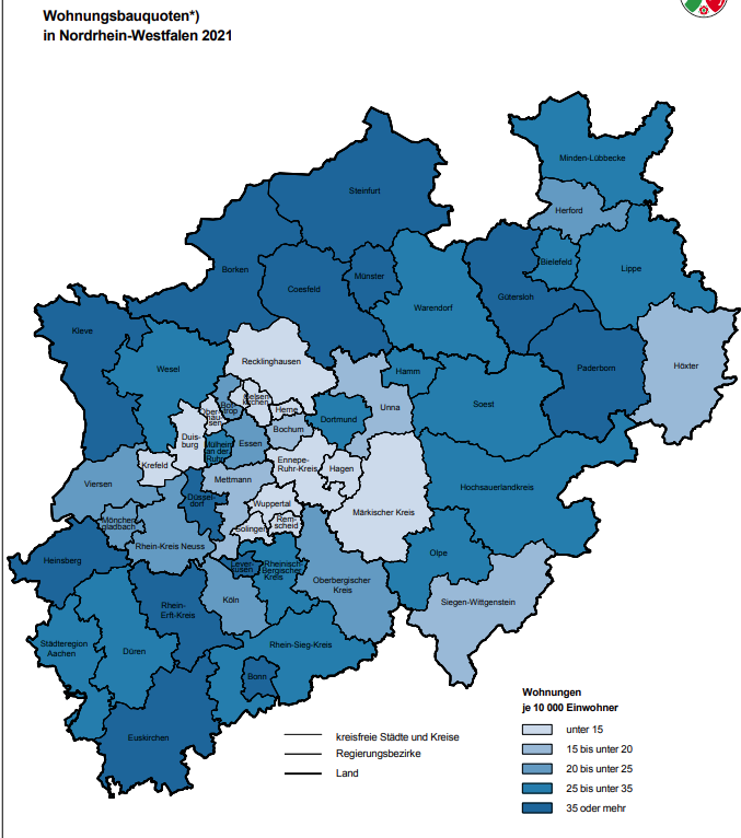 Bezieht man die Zahl der fertiggestellten Wohnungen (ohne Wohnheime) auf die Einwohnerzahl, so ergibt sich für das Jahr 2021 im Landesdurchschnitt eine „Wohnungsbauquote” von 28,6 fertiggestellten Wohnungen je 10.000. Einwohner. Damit liegt der Hochsauerlandkreis NRW-weit im Mittelfeld. Die höchsten Fertigstellungsquoten wiesen die Kreise Coesfeld (53,0), Paderborn (55,3) und Borken (58,0) auf. Die niedrigsten Quoten