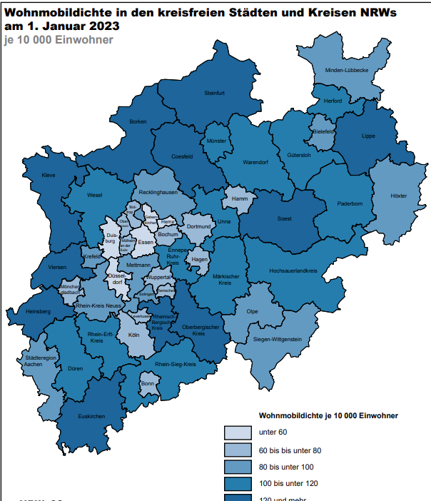 NRW-weit gibt es die meisten Wohnmobile in Coesfeld. Dort kommen 156 Wohnmobile auf 10.000 Einwohner.