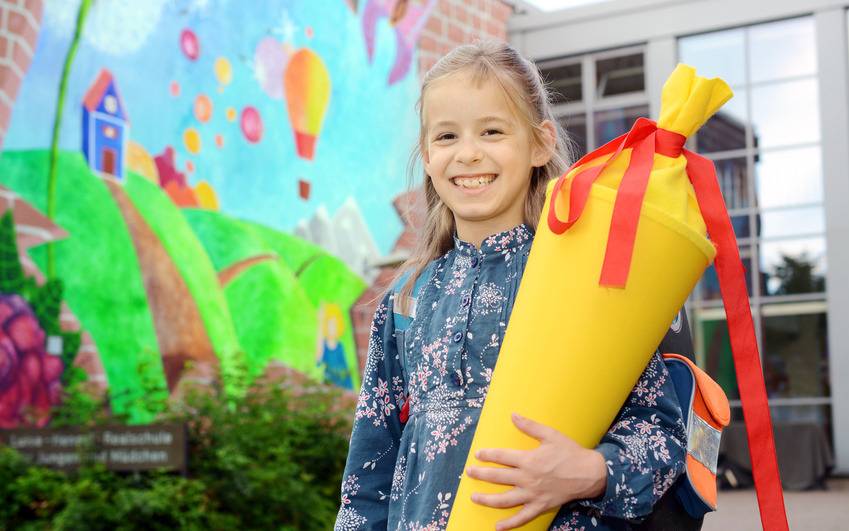 Mit einer Schultüte in den Händen brechen die i-Dötzchen heute zu ihrem ersten Schultag auf.