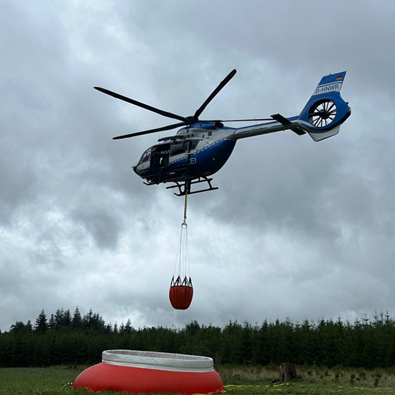 Mittels mehrerer wasserführender Fahrzeuge stand zeitnah eine große Menge Löschwasser zur Verfügung, weiteres Löschwasser konnte – wie am Wochenende zuvor – aus einer Baugrube für eine Windkraftanlage entnommen worden.