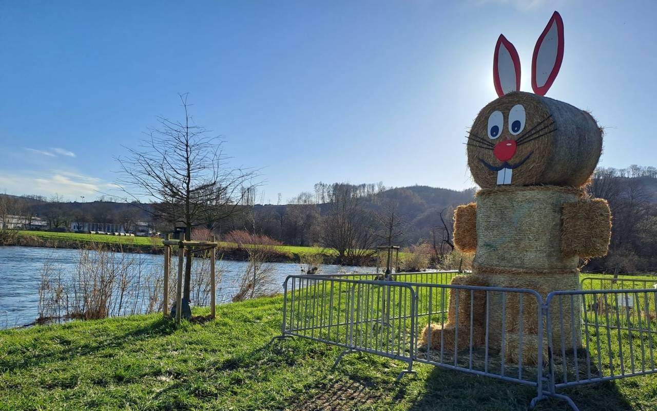 Auf der Eiswiese in Arnsberg-Oeventrop steht seit neustem ein fünf Meter großer Strohballen-Osterhase. Zudem soll, passend zum Osterfeuer, ein sauerlandweiter Rekord aufgestellt werden.