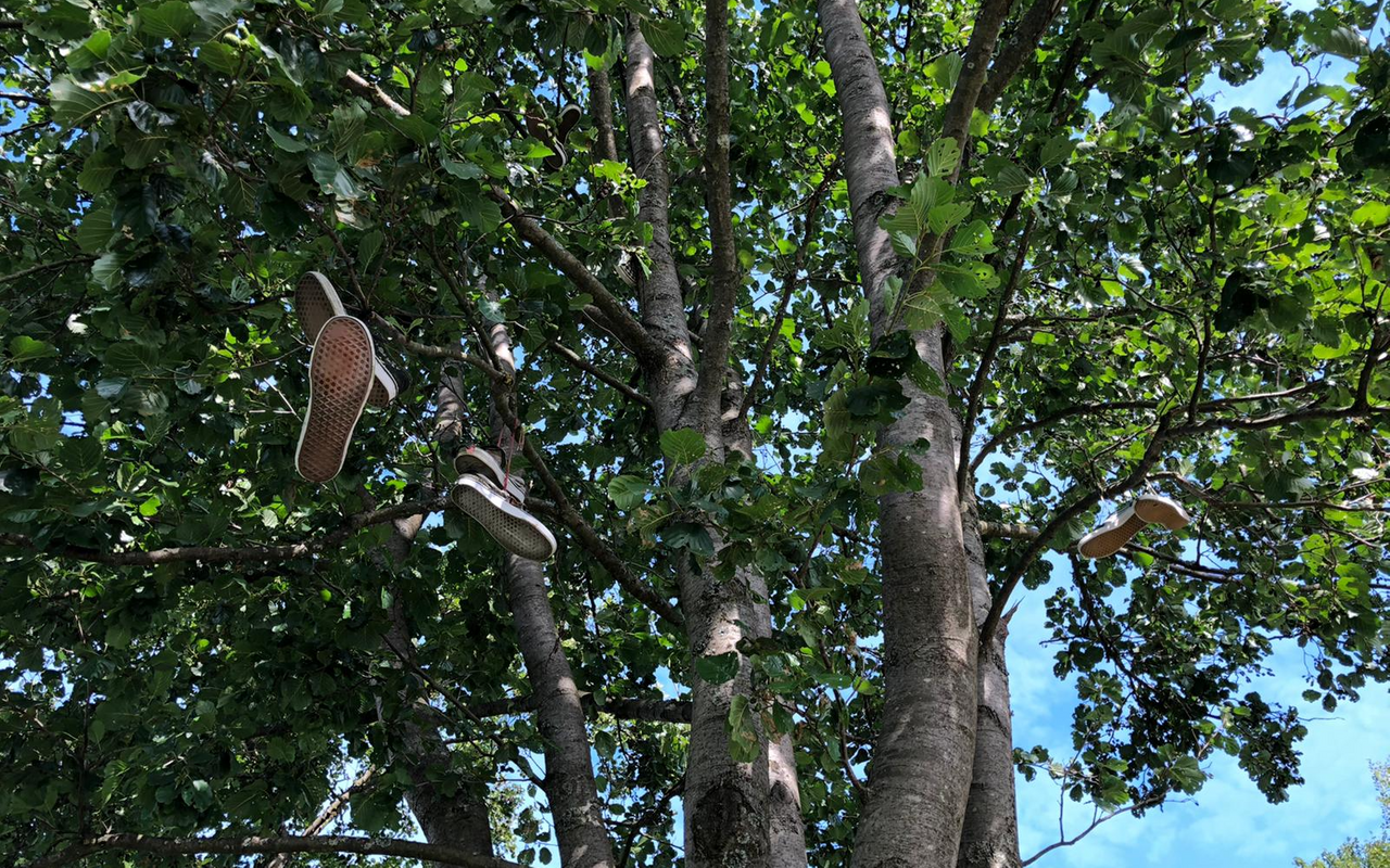 In dem Baum hängen Turnschuhe. Die Idee dazu kommt aus Amerika, dort hängen Skater ihre alten Skaterschuhe in die Bäume. In Winterberg gibt es eine Wasserski bzw. Wakeskate-Anlage. Daher kam vor etwa sechs Jahren die Idee, den amerikanischen Brauch dort zu übernehmen.
